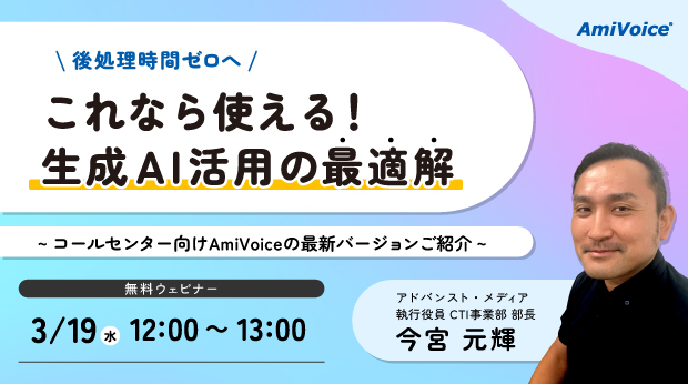【オンラインセミナー】<後処理時間ゼロへ>これなら使える!生成AI活用の最適解~コールセンター向けAmiVoiceの最新バージョンご紹介~【3月19日(水)開催】 (2025年3月9日) – Excite Bit コネタ 2025年3月10日2025年7月17日ai 2025年3月19日(水)、株式会社アドバンスト・メディア(本社:東京都豊島区、代表取締役会長兼社長:鈴木清幸以下、アドバンスト・メディア)は、「<後処理時間ゼロへ>これなら使える!生成AI活用の最適...