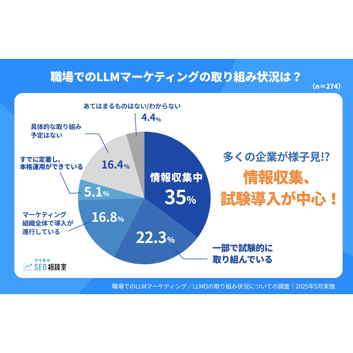 LLMマーケティングは情報収集・試験導入のフェーズ?事業の競争力を高める施策として関心高まる【ナイル調査】 – 株式会社ヴァリューズ 2025年6月25日2025年7月19日ai ナイル株式会社は、企業のデジタルマーケティング従事者を対象に、LLM(大規模言語モデル)マーケティングの導入状況から検討施策、サイトへの影響、課題についてまでアンケート調査を実施し、結果を公開しました...