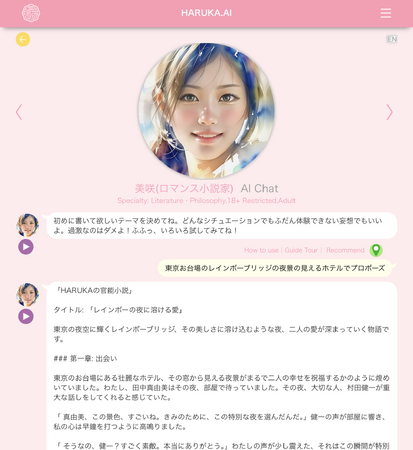 HARUKAにAIラブロマンス小説家がデビュー。無限のロマンス、AIが描く新時代のラブストーリー。AI小説家による女性のための新たなラブロマンス体験の誕生! (2024年6月24日) – Excite Bit コネタ