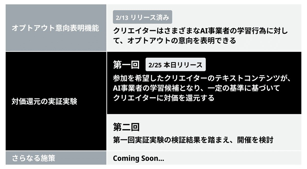 note、AI学習に協力したクリエイターに対価を還元する「AI学習対価制度」の実証実験を開始 – goo.ne.jp 2025年2月26日2025年7月16日ai note株式会社は、同社が運営するコンテンツプラットフォーム「note」において、AI学習に参加したクリエイターに対価を還元する「AI学習対価制度」の実証実験を開始する。申...