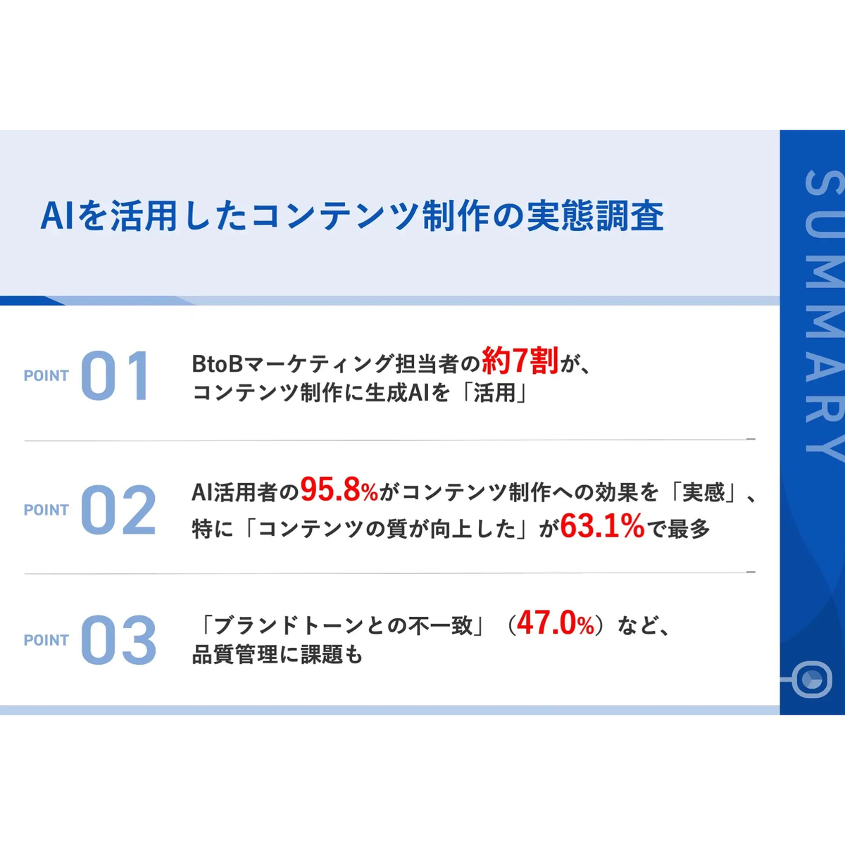 BtoBマーケ担当者の95.8%が生成AIによるコンテンツ制作で効果を実感!一方で「ブランドトーンとの不一致」など品質管理に課題も【IDEATECH調査】 – 株式会社ヴァリューズ 2025年7月11日2025年7月20日ai 株式会社IDEATECHは、BtoB企業においてコンテンツ制作に関わっているBtoBマーケティング責任者・担当者を対象に、AIを活用したコンテンツ制作の実態調査を実施し、結果を公開しました。