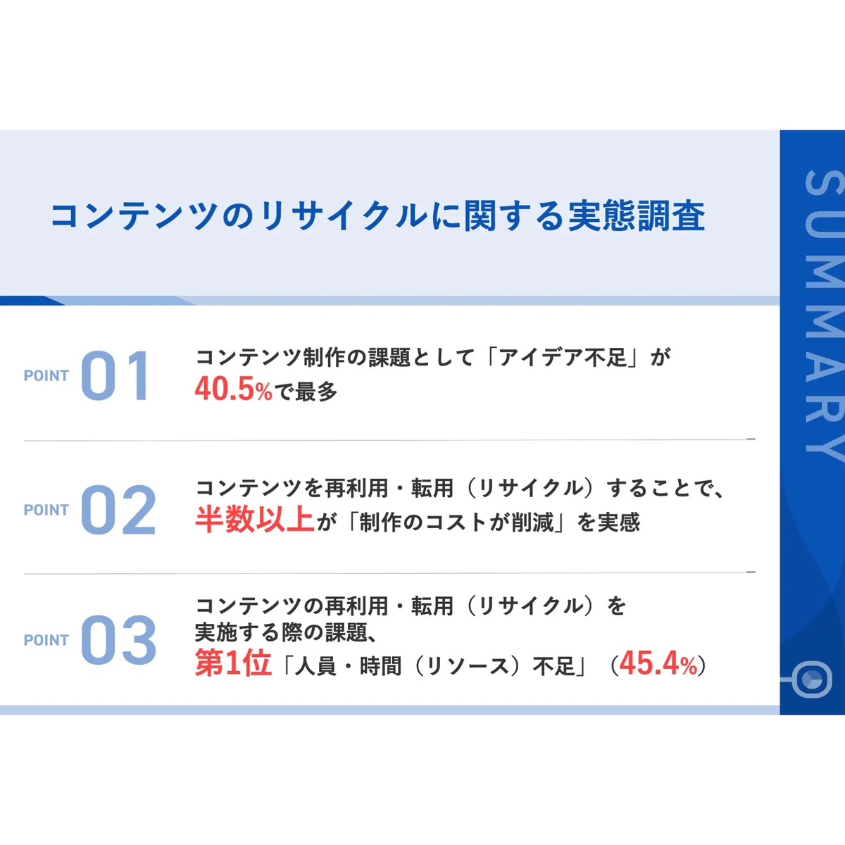 BtoB企業の約4割が「アイデア不足」がコンテンツ制作の課題に!7割以上がリサイクルはマーケティング効果を高めると注目【IDEATECH調査】 – 株式会社ヴァリューズ 2025年6月13日2025年7月19日ai 株式会社IDEATECHは、BtoB企業に勤めるコンテンツマーケティング担当者を対象に、コンテンツのリサイクルに関する実態調査を実施し、結果を公開しました。