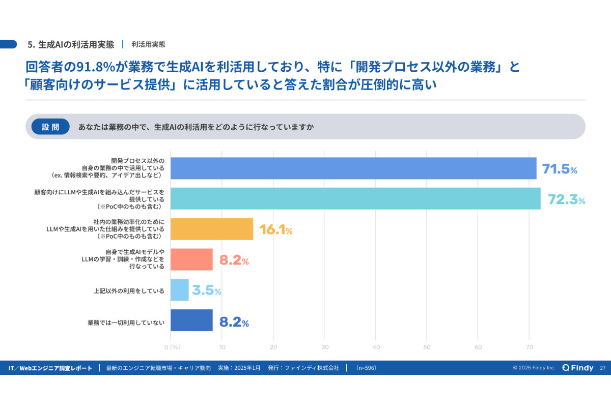 IT/Webエンジニア「業務で生成AIを活用」が9割 – 最も使われているツールは? – ライブドアニュース 2025年4月8日2025年7月17日ai ファインディは3月24日、「IT/Webエンジニアの転職市場・キャリア動向・AIの活用状況に関する調査」の結果を発表した。同調査は1月28日〜2月7日、IT/Webエンジニア596名を対象に、インター...