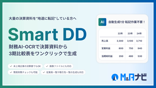 M&Aナビ、財務3期比較を自動生成 AI‐OCRで読み取り – nikkinonline.com 2025年8月23日2025年8月23日ai M&A(合併・買収)・事業承継プラットフォームを手掛けるM&Aナビ(東京都)が開発した財務分析レポー